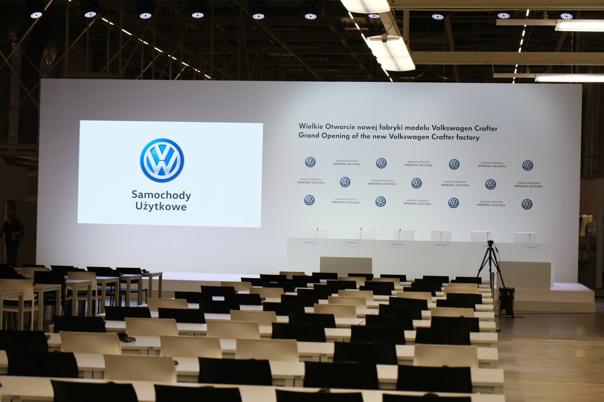 Wielkie otwarcie fabryki Volkswagena w październiku 2016 r. – w nowej hali w Białężycach przeznaczonej do produkcji m.in. Craftera – było okazją do zorganizowania uroczystej gali. Nasza firma zapewniła na to doniosłe wydarzenie technikę światła, dźwięku i obrazu – na odbywającą się równolegle konferencję prasową. Galę uświetniły nie tylko przemowy Zarządu i wielu znakomitych Gości, ale również występy artystyczne oraz koncert pod batutą Adama Sztaby.